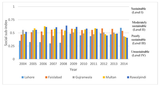 Trend of the social dimension (sub-index) for the five cities of Punjab, Pakistan.