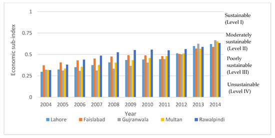 Trend of the economic dimension (sub-index) for the five cities of Punjab, Pakistan.