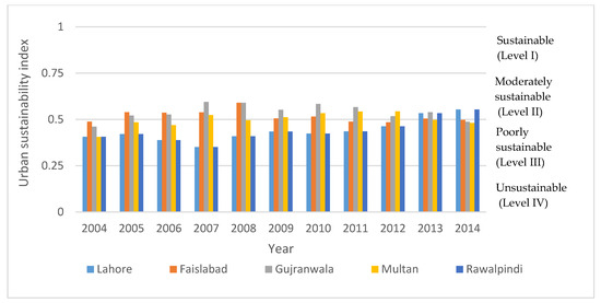 Trend of urban sustainability index for the five cities of Punjab, Pakistan.