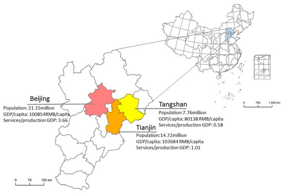 China is a rapidly urbanising country with 54.77% of its population living in urban areas by 2014 [35]. The Jing-Jin-Ji (Beijing–Tianjin–Hebei) urban agglomeration—located in the North China Plain and bordering the Bohai Sea—is regarded as one of the key economy growth pillars of China. Beijing, Tianjin, and Tangshan (a city of Hebei province) are three of the most economically-developed cities with different characteristics in this urban agglomeration (Figure 1).