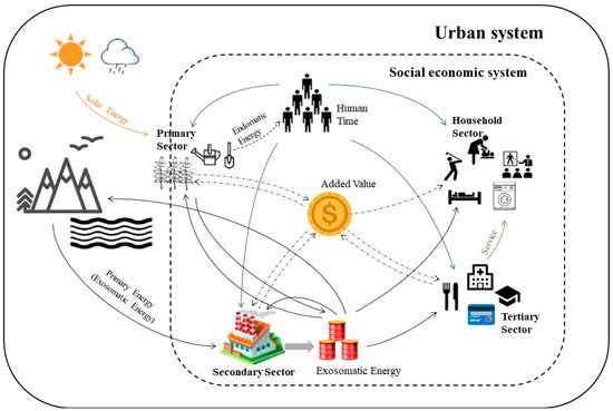 The “societal and ecosystem metabolism” is a notion that urban system can be analysed based on the descriptions of energy and material transformation processes that evolve over time [40]. Figure 2 shows the schematic of urban system under this methodological framework. The two terms, namely, “endosomatic metabolism” and “exosomatic metabolism”,—which originated from the double metabolism theory of Lotka [41]—should be distinguished to understand the nature of the MuSIASEM approach. Endosomatic metabolism refers to the flows of energy—called ‘‘endosomatic energy’’—that are contained in food to support human physiological processes. Meanwhile, exosomatic metabolism refers to the flows of energy—called ‘‘exosomatic energy’’—that are metabolised outside the human body to support production and consumption. Furthermore, the flow–fund scheme was incorporated into the MuSIASEM approach. Flow coordinates are elements that enter but do not exit the economic processes (e.g., energy and mineral inputs) or elements that only exit without having entered the processes (e.g., new products, added value and wastes). These coordinates are consumed or produced within economic processes. Fund coordinates are agents that enter and exit the processes (e.g., human beings, technical capital and Ricardian land), thereby transforming input flows into output flows. These coordinates are used but not consumed within economic processes and must be periodically renewed [42]. Therefore, fund coordinates entail an overhead for their maintenance and reproduction. The sustainability of economic systems depends on the steady flows under the constraints determined by the characteristics of the funds. Intrinsically, the integrated analysis of societal and ecosystem metabolism utilises a series of flow–fund, fund–fund, and flow–flow ratios to diagnose the metabolic patterns of the urban system.