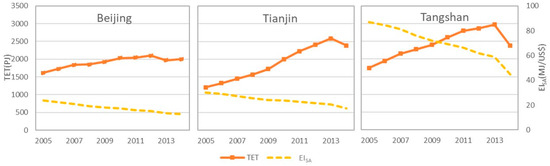 Over the study period (2005–2014), GDP continuously increased at an annual average rate of 8.9%, 13.0% and 10.5% in Beijing, Tianjin, and Tangshan, respectively. THA increased more slowly than GDP. For Beijing and Tianjin, the annual growth rate of THA was approximately 3.5%, whereas it was only 0.6% for Tangshan (Table 3). As for energy consumption, TET increased with the development of the economy, especially for Tianjin and Tangshan (Figure 3). However, a downward trend was observed in the energy intensity of the societal average (EISA), which indicated the improvements of energy efficiency at the city level.