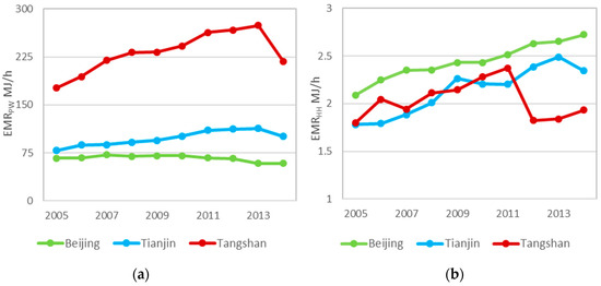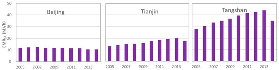 Figure 5b shows that Beijing had the highest as well as increasing EMRHH, which indicated the highest and improving material standard of living of the city. Tianjin also showed a similar trend to that of Beijing but with some fluctuations. The EMRHH of Tangshan was similar to that of Tianjin before 2011 but decreased to the lowest in 2012 and during the next two years, which may be due to the heating systems of Tangshan being technically upgraded to save more energy over these years.