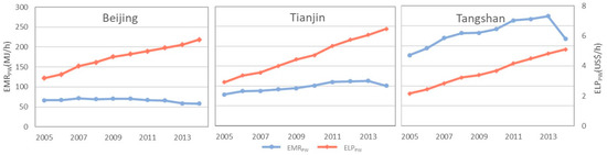 In addition, the relationships between EMRPW and ELPPW in the three cities varied (Figure 6). Generally, a positive correlation between EMRPW and ELPPW exists because of the following two perspectives: higher EMRPW indicates an increased use of machinery and tools for production of goods and services, thereby promoting a greater ELPPW [25]; and higher EMRPW indicates greater capitalisation of production, implying larger costs that will not be covered unless this change allows greater ELPPW [32]. However, the ELPPW of Beijing significantly increased with a decreasing EMRPW. Tangshan had the lowest ELPPW but the highest EMRPW among all the three cities. Their different behaviours were also due to the structural composition of the economy. Beijing experienced a structural change that reduced human activity in the secondary sector with higher EMR and increased human activity in the service sector with lower EMR but higher ELP, whereas Tangshan depended more on the secondary sector characterised by higher EMR. More analysis needs to be conducted to explore the reasons at level n − 2.
