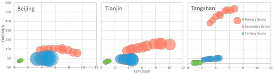 In Tangshan, a total of 10.7% of human activity moved from the primary sector to the secondary and tertiary sectors in the analysis period. By contrast, the EMR2 of Tangshan was 3.3 times higher than that of Beijing and 1.3 times higher than that of Tianjin. Nevertheless, the ELP2 of Tangshan was lower than that of Beijing and Tianjin due to the low energy efficiency of its leading industries (e.g., the first four sub-sectors shown in Table 4). The same pattern was also observed for the tertiary sector of Tangshan. As a result, the higher level of EMRPW did not bring the higher level of ELPPW, namely, higher economic efficiency.