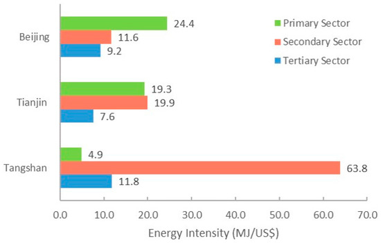 Energy Intensity (EI) of the three sectors in Beijing, Tianjin, and Tangshan in 2014.