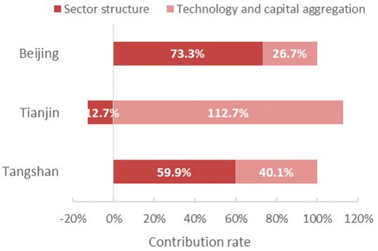 Figure 9 presents the contribution rates of technology and capital aggregation (raggregate) and sector structure (rstructure) to the changes of EMRPW by using a complete decomposition model. For Beijing, the sector structure and aggregation factors accounted for the decrease of EMRPW by 73.3% and 26.7%, respectively. For Tianjin, the aggregation factor drove the increase in EMRPW, whereas the sector structure factor impeded it. For Tangshan, the sector structure and aggregation factors both contributed to the increase in EMRPW by 59.9% and 40.1%, respectively.