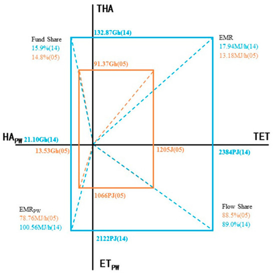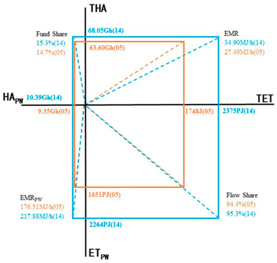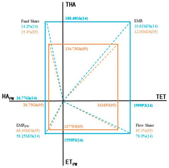 The classical four quadrants were employed to reveal the evolution of different urban metabolism in Beijing, Tianjin and Tangshan (Figure 10, Figure 11 and Figure 12). The rightward horizontal line represents the TET (level n); the upward vertical line represents the THA (level n); the leftward horizontal line represents the HAPW (level n − 1); the downward vertical line represents the ETPW (level n − 1); and the orange and blue figures present the years 2005 and 2014, respectively.