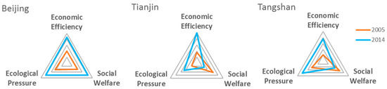 Combined with the dimensions of sustainable development, no problems were observed in the development dimensions because all three cities had increasing economic output and growing human activity to support it. However, in the coordination dimension, Tangshan performed poorly. All three cities faced challenges from the sustainability dimension due to increasing energy consumption and ecological pressure. Particularly, Tianjin and Tangshan suffered from the sustainability dimension because of the low level and decreased trend of social welfare.