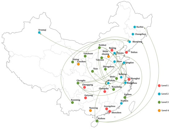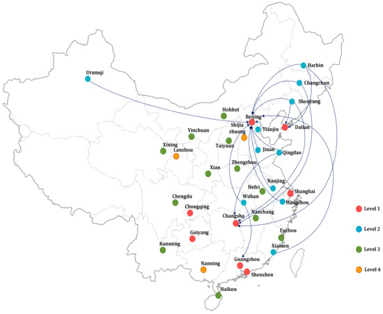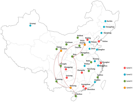 To find out the possible benchmarks and make level-by-level improvement for inefficient cities in , and , the progress measure, model (4), is then applied. The results of optimal solution to model (4) are shown in Table 4, where column 4 reports the benchmarks for inefficient cities in on the SD pathway from Llo to Llo-1 and column 5 to 12 show the potential improvement of energy consumption, labors, fixed investments, GDP, SEEE, unemployment rate, air pollution index and PM2.5 in percentage terms (%), calculated by optimal slack variable divided by the raw data for each input, desirable output and undesirable output, i.e., , and . For example, in terms of SD pathway L3 to L2, Chengdu in can choose {Tianjin, Hangzhou, Wuhan, Qingdao}as the benchmarks and make potential improvement on retracting labors (26.66%), unemployment rate (0.5%) and air pollution index (4.03%), and expanding SEEE (70.95%). The outcomes of these analyses can be visualized in a geographical view, the following Figure 1, Figure 2 and Figure 3 respectively demonstrate the SD pathways of L2 to L1, L3 to L2 and L4 to L3.