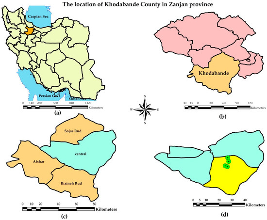 Study area of central district of KharaRud County. (a) Map of Iran; (b) Khodabande County; (c) Central district of KharaRud; (d) The studied villages.