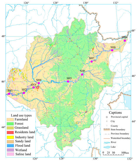 Land use types along the Songhua River are one of the most important factors that influence the water quality in the Songhua River. Therefore, they also influence ecological health and sustainability in different ecosystems along the Songhua River. In the upstream of the Songhua River, the main land use types along the river are farmland and grassland (Figure 1). From SH1 to SH3, industrial and transportation lands are also distributed along the Songhua River. Recently, more and more wetland reserves have been established and protected in the upstream and midstream of the Songhua River. Wetland distribution areas could work as natural water purification zones to improve the water quality in the Songhua River [38,39]. In the midstream of the Songhua River (From SH4 to SH6), farmlands are primarily distributed along the mainstream of the Songhua River, and forests are distributed in the tributary region of the Songhua River. In the downstream of the Songhua River, the proportions of forest in the tributary regions decreased while farmland increased. Different types of land and major human activities along the Songhua River influenced the river water quality. Sanjiang plain, one of the most important farmland regions in China, is located at the downstream of the Songhua River. Water quality influenced by pollutant sources in the upstream of the Songhua River also affected the water quality in the downstream, thus directly influencing food safety in regional agriculture.