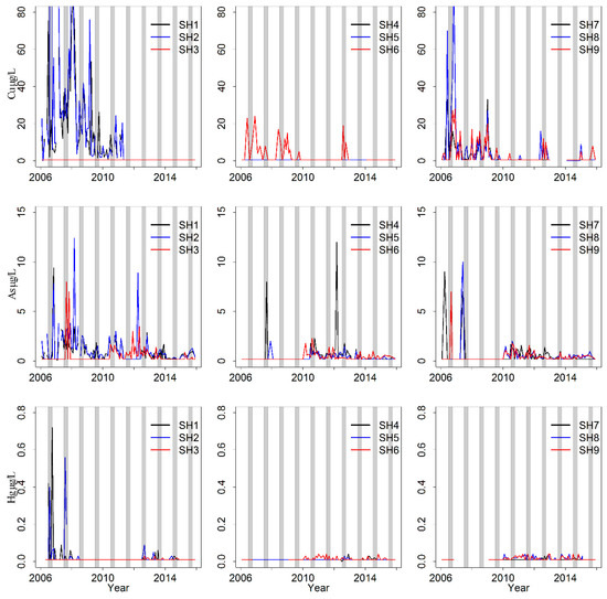 In this study, we used the concentrations of Cu, As and Hg as indicators to evaluate the degree of heavy metal pollution in the Songhua River (Figure 4). Before 2012, the range of Cu concentrations in SH1 and SH2 were from 5 to 80 μg/L and much higher than those in other sampling sites. In addition, in SH8, high Cu concentrations (higher than 60 μg/L) appeared for several months before 2008. After 2012, the Cu concentrations in SH1 and SH2 decreased greatly and fell below detection limit (4 μg/L). Cu concentrations in SH3, SH4 and SH5 were below detection limit during the last 10 years. In SH7 and SH9, the Cu concentrations fluctuated from 0 to 20 μg/L before 2010, and fell below detection limit in most months from 2010 to the present. Similar to Cu, the concentrations of As in SH2 and SH3 were from 0 to 10 μg/L before 2010 and higher than those after 2010. Three times as high As concentrations (around 10 μg/L) were found in SH2 and two times as high concentrations were found in SH4 during non-flood season. Prior to 2010, concentrations of As in most downstream sites were below the detection limit and fluctuated from 0 to 1 μg/L after 2010. Hg concentrations in all sampling sites except SH1 and SH2 were near the detection limit with fluctuations from 0 to 0.05 μg/L. In SH1 and SH2, Hg concentrations were higher than 0.4 μg/L for a few months before 2008. After 2008, Hg concentrations in SH1 and SH2 decreased greatly and were close to the detection limit and similar to the other sampling sites.