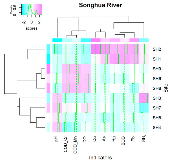In order to evaluate the spatial variations of water quality in the Songhua River, the average concentrations of each indicator from the nine sampling sites during 2006 and 2015 were used for heat map analysis, and the results are shown in Figure 5. Based on the heat map analysis, the nine sampling sites can be divided into three groups from upstream to downstream. The first group included SH1 and SH2. In these two sites, the scores of heavy metals and BOD were the highest, and the scores of other indicators were the lowest. High scores of heavy metals and BOD indicate high concentrations of heavy metals and BOD. Regional industry development often accompanied increased concentrations of heavy metals in regional ecosystems [30]. In addition, organic pollutants produced from industrial and residental sources could lead to increases in concentrations of BOD in the water system [31,32]. Changchun, a huge city with more than half of its GDP coming from industries and a population greater than seven million, is located at the upstream of these two sites (Figure S2). Fast developing industry in Changchun could be the main cause of higher concentrations of heavy metals and BOD in the upstream of the Songhua River than those in the downsteam, as indicated by the higher scores of related indicators in the SH1 and SH2 sites.