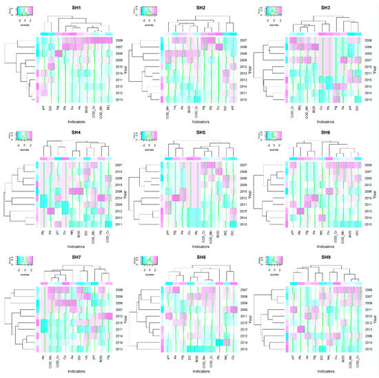 Annual average concentrations of the nine indicators from 2006 to 2015 were used for evaluating the temporal variations of water quality in each sampling site. Similar to the spatial heat map analysis, indicators and years were treated as two objects to classify groups, as shown in Figure 6. Based on the heat map analysis in the previous section, water quality in the nine sampling sites could be divided into three groups. The first group located at the upstream of the Songhua River included SH1 and SH2. In this group, high concentrations of heavy metals and low pH values were seen in the initial years of the past 10 years. In SH1, the high concentrations of heavy metals and low pH values in the first two years (i.e., 2006 and 2007) were different from the other periods and similar trends of heavy metal concentrations were also observed in SH2 in the first four years. In later periods, water quality in the upstream of the Songhua River improved and the values of pH and DO concentrations increased from 2010 to 2015. As mentioned in the previous discussion section, industrial wastewater from two large cities resulted in the high concentrations of heavy metals in the upstream of the Songhua River between 2006 and 2009. With industry wastewater quality standards rising and more stringent environmental monitoring by local governments, less untreated wastewater flowed into the Songhua River [12], thus greatly improving the water quality in the upstream of the Songhua River. For instance, concentrations of DO increased from 2010 to 2015 and the pH also increased gradually.