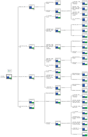 Figure 3 presents the third tree-based model that analyzes which types of circular economy activities undertaken by European SMEs interact with other characteristics of the companies and influence their economic performances. The constructed model comprises 46 nodes, out of which 25 are terminal ones. The percentage of correct classification is 62%.