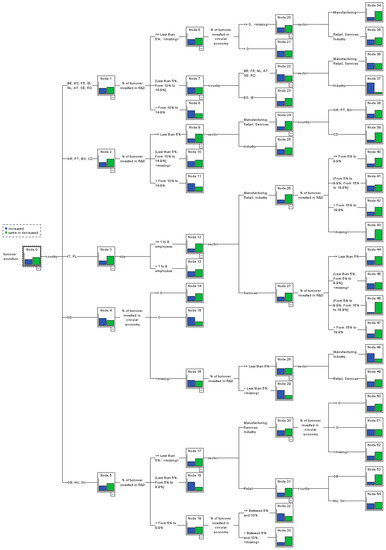 The model shows that the country of the SMEs is the main predictor of their economic results. The resulting nodes of the SMEs based by the country variable are similar to those in the previous model. For SMEs from Belgium, Spain, France, Ireland, The Netherlands, Austria, Sweden, and Romania, the use of renewable energy influences their economic performances in a positive manner. For SMEs that didn’t undertake the use of renewable energy, redesigning products and services to minimize the use of materials or the use of recycled materials results in better economic results, especially in sectors such as manufacturing, retail, and industry. For SMEs that undertook some activities related to the use of renewable energy, the activities of redesigning products and services to minimize the use of materials or the use of recycled materials are not associated with improved economic results. So, for SMEs from Belgium, Spain, France, Ireland, The Netherlands, Austria, Sweden, and Romania, improved economic results are obtained by those undertaking the use of renewable energy (54%). The improved economic performances are even wider spread among SMEs from France that use renewable energy in their current activity (89%). Also, increased turnover is registered by SMEs from this group of countries that redesign products and services to minimize the use of materials or the use of recycled materials (49%), especially in the case of the manufacturing, retail, and industry sectors (54%).