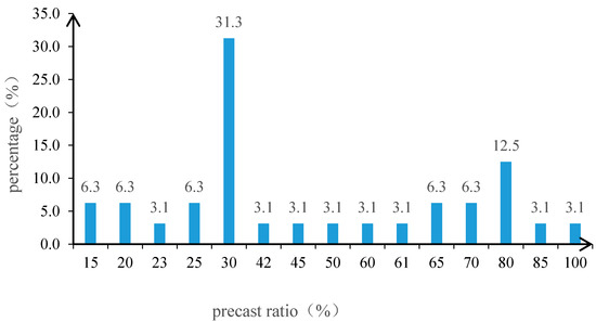Among the respondents, 30% were clients (firm 1); 16% were designers (firm 2); 11% were supervisors (firm 3); 16% were PC manufacturers (firm 4); 20% were on-site contractors (firm 5); and 7% were researchers (firm 6). Furthermore, 10% were top managers (group 1); 27% were middle managers (group 2); 26% were first-line managers (group 3); and 37% were technician (group 4). Meanwhile, 72% of the interviewees had both knowledge and experience [57] (series 1) in prefabrication and 28% were hade knowledge and practical experience in on-site construction but not in prefabrication (series 2). The survey revealed that 81% of the surveyed projects were residences. Meanwhile, 45% were reinforced concrete structure; 33% were frame-shear wall structure; and 22% were steel structure. Precast ratio (by volume) has been often used as a standard for evaluating prefabrication development (Figure 1) [41]. The survey investigated that the highest proportion (31.3%) of the precast ratio was 30%. The phenomenon was attributed to that the government required that the precast ratio to reach 30% by 2020. The ratio of 80% was the second highest proportion (12.5%), mainly rooted in steel structure building. The precast ratio of steel structure systems was higher than that of reinforced concrete systems, because steel is easy to be prefabricated [16].