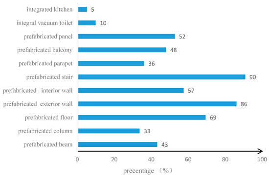 The study counted general PC used in prefabrication (Figure 2): 90.5% were precast staircase; 85.7% were precast facades; and 69.0% were semi-precast slab. In addition, 9.5% were integral vacuum toilet; and 4.8% were integrated kitchen. This was because the whole kitchen and toilet tended to have waterproof and water leakage problems.