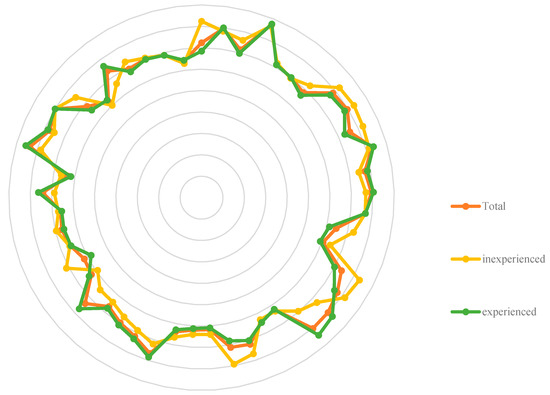 The independent sample t-test has been commonly used to examine whether the mean values of a specific variable from two independent groups were significantly different [16,52,59]. Table 4 suggests that there exists deviation between experienced and inexperienced respondents (Figure 3). For the experienced ones, “Specification and standards for prefabricated building design”, “Related experience of manager”, “Capacity of production line in PC”, “Rationality of PC split”, “Order quantity of PC”, “Coordination of connection nodes of PC components”, “Coordination between designer and PC manufacturer”, “Operant level on installation personnel”, “Node coordination between PC and on component”, and “Reuse rate of PC mold” were the important factors. The experienced practitioners tended to pay more attention to the practical problems in the construction process [60], such as specification and standards guidance for design, production and installment, capacity of production line, PC split and technical connection nodes. However, as for inexperienced practitioners, “Specification and standards for prefabricated building design”, “Collaborative capacity among professional designers”, “Specification and standards for PC production”, “Coordination between designer and client”, “Related experience of designer”, “Design level of teamwork”, “Rationality of PC split”, “Design plan for PC production line”, “Operant level on installation personnel”, and “Technical standards system of prefabricated building” were the important factors. Inexperienced respondents highlighted the regulations, potential risks and expenses. Different from the experienced group, the inexperienced respondents took “lack of professional personnel” and “training cost” into account when they decided whether to choose the prefabrication method or not [15]. Using Factor Analysis, the survey found that deviation between two series were from some factors (Figure 4), including FD1, FD7, FD8, FD10, FD15, FPT1, FPT2, FPT3, FPT4, FPT7, FPT8, FPT16, FPT18, FPT22, FC1, FC4, and FC6. Those factors were divided into two parts: practical and potential factors. The experienced respondents placed emphasis on practical problems in the production and installation process. However, the inexperienced ones pay more attention to the potential risk and expenses [61], such as training cost of professional personnel [44], procurement costs of machine [35], etc.