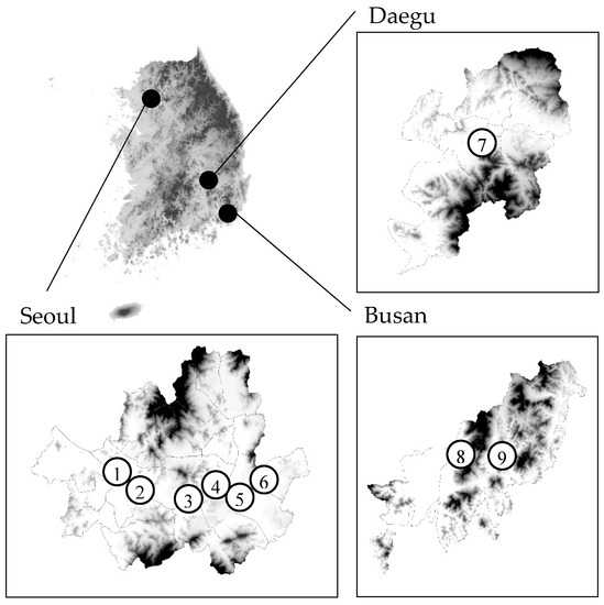 Thus, Seoul, Daegu, and Busan were selected from the seven megacities in South Korea, all of which have a population greater than 1 million, with consideration for geographical characteristics. Seoul is the capital of South Korea, and is located in the northwestern portion of the country, Daegu is basin-like, and so one of the hottest cities in South Korea, and Busan is a coastal city that is located at the far southeastern portion of South Korea.