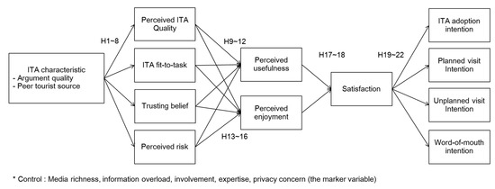 TCITAs would have two salient characteristics of the well-structured form of argument and peer tourist source of argument in this study. Because ITAs are also the message for persuading potential tourists, ITAs could be a type of argument [11]. A claim of ITAs could be an assertion that the destination is attractive to visit. Data could be the beautiful pictures about the destination. Warrant could be the proposition that destination visitors would enjoy their journey, which pictures would show. Backing could be the stories, schedules, tips, knowledge, know-how, and experiences that explain how visitors enjoy their journey, such as pictures. Different from traditional ITAs, which merely show pictures, TCITAs can provide almost all the claim, data, and backing. TCITAs could be regarded as a well-structured form of argument that could be considered highly qualified information and could be easily adapted to a specific situation by providing the contextual backing information. TCITAs could also be considered as the intentional disclosure of information to help tourists and to protect tourists from unexpected loss. The argument quality (i.e., well-structured form of argument) of ITAs could increase four antecedents of information adoption. Therefore, I hypothesized the following: