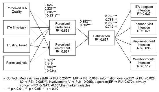 The hypotheses from H9~H22 were validated using 200 iterations of the bootstrapping technique in PLS algorithm [54,55]. The explanatory power of each dependent variable could be accessed by checking its R2 value. I assessed the standardized path-coefficient and p-values of each path, which is the two-tail test result with a significance level of 0.05. The PLS results are shown in Figure 2. All hypotheses except three (H5: the path from perceived ITA quality to perceived usefulness, H10: the path from information fit-to-task to perceived enjoyment, and H12: the path from perceived risk to perceived enjoyment) were significantly approved. R2 values of the dependent variables are calculated as perceived usefulness (0.691), perceived enjoyment (0.557), satisfaction (0.677), ITA adoption intention (0.637), planned visit intention (0.571), unplanned visit intention (0.633), and word-of-mouth intention (0.517).