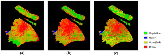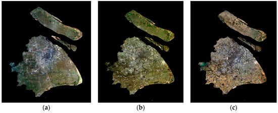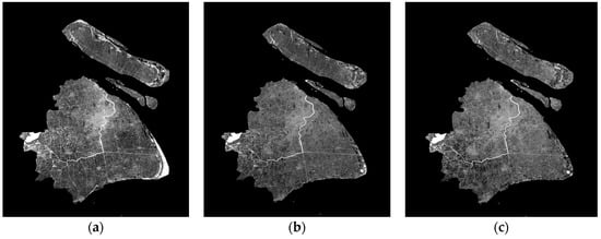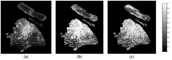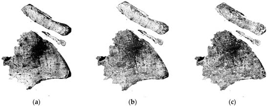 (a) IS extraction result of Shanghai in 2002; (b) IS extraction result of Shanghai in 2007; (c) IS extraction result of Shanghai in 2013.