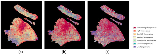 According to the land surface temperature retrieval result, the temperatures are divided into seven intervals for fair analysis considering that different days in divergent months have different land surface temperatures. The distribution maps are shown in Figure 10. Their main characteristic is that the high temperature zone expands from the central urban area to the outskirts. Through the comparison of SUHI intensity maps, areas of heat islands are shown to increase, mainly in the city’s center and the centers of districts from 2002 to 2007. However, the heat island effect shows signs of abating from 2007 to 2013, and the expansion of the medium temperature zone and sub-high temperature zone generally focuses on Pudong, Nanhui and Fengxian. The area of extreme high temperature zones and high temperature zones is decreasing, and their distribution becomes scattered, not solely focusing on the city’s center and centers of districts. Low temperature zones are located in the outskirts of Shanghai, mainly in Fengxian, Jinshan and parts of Pudong and Nanhui.