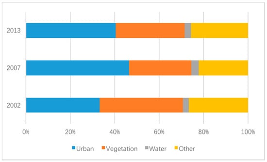 Furthermore, the average LSTs of four types of land use in 2002, 2007 and 2013 were marked in Figure 12. The difference between the average temperature of urban and vegetation areas in 2007 exhibited a maximum value among the three phases of images, which was exactly in accordance with the differences of their areas. Thus, a general result could be drawn that the missing vegetation coverage that turned into ISA led to the intensifying of SUHI, which also verified the impact of LUCC on LST.