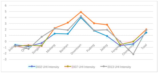 Figure 13 demonstrates that the heat island intensity gradually decreases from the city center to the suburbs, and reaches the maximum positive value in the city center, while the heat island intensity in the outer suburbs is negative. From the trend of the entire curve, it is easy to see that the heat island effect is the strongest in 2007, while in 2013, it dropped slightly.