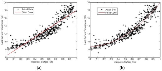 Studies demonstrate that IS has a warming effect which is a key indicator in urban planning [28,29,30], consistent with the conclusion of this study. Xu stated that LST and IS have exponential relationships [28], while Cao illustrated their linear positive correlation [30]. Based on the conclusion drawn from Figure 14, both linear fitting and quadratic fitting methods showed a high goodness of fit. This means that an exponential correlation exists due to variations of imaging time and actual on-site conditions.