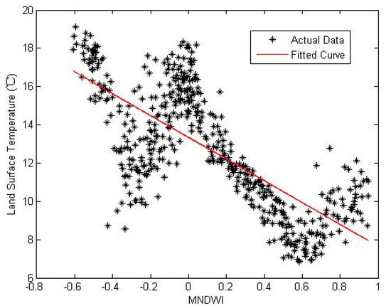 A total of 500 sample points were randomly generated by means of MATLAB. The impervious surface rates, NDVI values, MNDWI values and corresponding land surface temperature were used to show the relationships (Figure 14, Figure 15 and Figure 16).