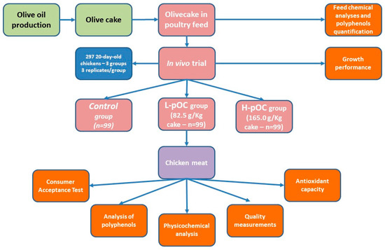 In virgin oil, a relationship between concentrations of simple phenols, lignans and secoiridoids, antioxidant activity and shelf life has been observed [5,8]. Furthermore, the advantage of using olive oil byproducts as feed supplements to reduce oxidative stress and improve meat antioxidant status, oxidative stability, and shelf life, has been demonstrated in different food producing animals, such as lambs [9], chickens [10,11], rabbits [3], and beef cattle [2]. However, no reports are available on the use of pOC and the metabolic pathway of these compounds in poultry.