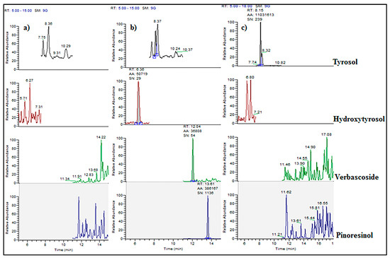 Regarding the analysis of P. major muscle samples, pinoresinol, verbascoside, and hydroxytyrosol were not detected (<0.5 µg/kg). Only tyrosol was detected in two samples belonging to the H-pOC group (8 and 47 µg/kg). In Figure 2, the LC-MS/MS chromatograms of a blank, spiked, and incurred meat sample are showed. Figure 2b demonstrates the ability of the here-developed method to determine polyphenols at trace levels (1 µg/kg).