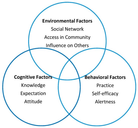 Social cognitive theory developed by Albert Bandura [15] provides a reciprocal causation model for expressing the psychological behaviors of individuals. The theory stresses that a continuous interaction between behavioral, cognitive and environmental factors determines the patterns of one’s behavior [16,17]. Behavioral factors involve skill, practice and self-efficacy, which thereby influence one’s thoughts and action. Cognitive factors, also called personal factors, involve prior knowledge, attitudes and expectations about outcomes. Environmental factors comprise culture and strategies, social norms, communications strategies and communities. Figure 1 shows the relationship of the three factors that determine human behaviors. The three factors do not need to have equal weight in causing these behavior patterns, but they are correlated to determine an individual’s behavior.