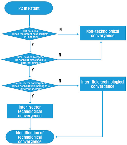 The technological convergence measurement process is as follows: First, the IPC code extracted from each firm’s patent is allocated to a field, of 35 in six sectors, as classified by the IPC-Technology Concordance Table. If a certain patent has multiple IPCs belonging to different field classifications in the same sector, this patent can be defined as having “inter-field technological convergence”. Further, if they belong to different field classifications in different sectors, this can be defined as “inter-sector technological convergence”. Consequently, this assumes a binary value of one if a patent belongs to inter-field or inter-sector technological convergence, and zero otherwise. Figure 1 illustrates the technological convergence identification process.