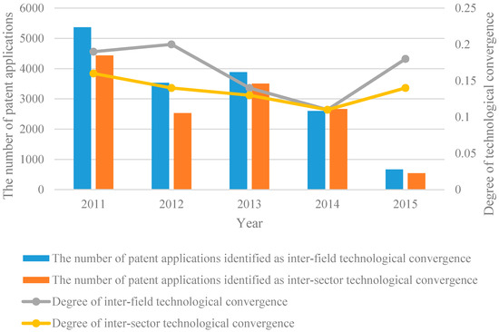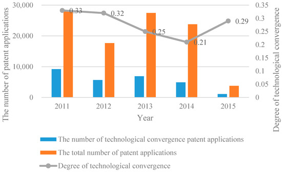 As a result of identifying the technological convergence for 3154 ICT firms, the following patent applications were judged as exhibiting inter-field or inter-sector technological convergence: 9211 in 2011, 5645 in 2012, 6885 in 2013, 4897 in 2014, and 1084 in 2015. The total patent applications and technological convergence patent applications merged in 2015 are inferior to those in other years due to incomplete patent application statistics, according to the most recent database year in 2015. As Table 3 and Figure 3 illustrate, the number of ICT firms’ technological convergence patent applications positively correlates with the total number of patent applications, and has gradually decreased since 2011. As the number of technological convergence patent applications in 2014 decreased by 47% compared to 2011—although 2013 has rebounded compared to the previous year—the output of converged innovation activities in the Korean ICT industry has significantly decreased. Additionally, the degree of technological convergence also declined, from 0.33 in 2011 to 0.21 in 2014, and rebounded to 0.29 in 2015. However, regarding the incomplete patent application statistics in 2015, the degree of technological convergence from 2011 to 2014 has also continuously decreased, as mentioned above.