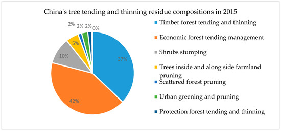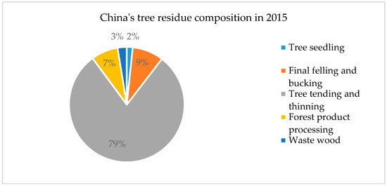 In the process of forest tending, sanitation felling of trees hit by abiotic and biotic damaging agents or trees in poor sanitation conditions mainly involved cutting trees without a cultivation future because of such harms [26], normally conducted in combination with other tending and felling, and is conducted alone only after a large-scale sudden disaster. Such residues have a high potential. In 2015 alone, 13,000 hectares of forest were hit by fire, and 12.18 million hectares hit by diseases, pests and mice [24]. However, considering the randomness of natural disasters and the lack of an authoritative dead wood felling guide, the statistical data is insufficient for estimating such residue. This study does not cover such estimation and leaves it for future research.