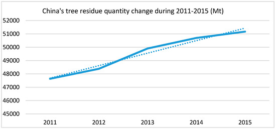 In 2016, all state-owned forestry farms and collectively-owned natural forests stopped commercial felling, directly resulting in a reduction of 5.56 million m3 in the log output. The reduction in the log output constrained the growth of tree residue before 2014. However, as the log output ceases to decline further, in accordance with the positive growth during the 12th Five-Year Plan period, and the main forestry indexes, such as forest coverage and forest reserves are linearly and steadily increase, as appears in the Forestry Development 13th and 12th Five-Year Plan [59,60], it is predicted that China’s tree residue will possibly continue the original upward trend as of 2017. The recycling and scientific and reasonable utilization of tree residue (according to the estimation results of this study, the vast majority of the tree residue in China comes from forest tending and thinning, final felling and bucking and forest product processing) can alleviate the contradiction between supply and demand caused by the decline in timber output, and can also create more economic benefits and increase employment, which should attract more attention from the government, enterprises and researchers.