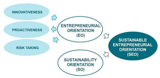 Another contribution that empirically analyzes the relationship between entrepreneurial intentions and SO is proposed by Wagner and Maximilians [21]. According to these authors, SO has a positive influence on the search for entrepreneurial opportunities related to sustainability, but not with entrepreneurial intentions, which are associated with entrepreneurial intent and direction. In short, for these scholars, what essentially drives entrepreneurship for sustainable development are entrepreneurial attitudes and not SO. Gawel [1] also examines the relationship between EO and sustainability, noting that while EO is part of the organizational culture and indicates a way of acting, sustainability is a set of principles and objectives. These social and environmental sustainability principles can be incorporated into the strategy and thus facilitate activities rebuilt by developing new products, new markets and new processes that provide measurable benefits to the organization. This author also proposes to measure the intensity of each of the dimensions of EO in relation to sustainability, reaching the following results: a high intensity in innovation and proactivity is related to the introduction of radical innovation in sustainable development issues, and a neutral intensity in risk taking promotes a strategy for a sustainable future. In this regard, Gawel [1] concludes that an organization’s involvement in sustainable development can be considered an entrepreneurial act.