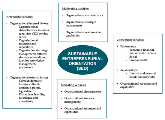 From the literature on strategic management, business, marketing, entrepreneurship, organization, strategy, business ethics, and sustainability, on the whole it can be gauged that EO and SO have been approached with antecedent, moderating, mediating and consequent variables in order to understand the role of these strategic orientations in the dynamic and changing environment of organizations. Since SEO is considered as a general high-order strategic orientation, researchers have the opportunity to test its relationship with the variables that allow them to be better familiarized with organizational behavior in a specific environment and in consideration of variables previously used in literature. Besides theoretical approaches to sustainable entrepreneurship, there is a need for more contributions based on empirical models that provide validity and reliability for these conceptual proposals. We offer a proposal of variables for empirical testing research in sustainable entrepreneurship with SEO as the key concept (Figure 3).
