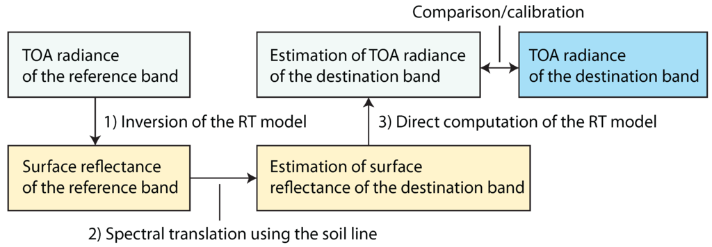 Band translation is inevitable for compensating the influences of differences in spectral responses in an effort to compare radiance outputs consistently. Band translation involves three steps: (1) the top-of-atmosphere (TOA) radiances of the reference band are first atmospherically corrected to retrieve surface reflectances by inverting a radiative transfer model; (2) the retrieved reflectance for the reference band is then translated to that of the destination band using the soil line (explained in the next paragraph); and (3) the translated surface reflectances are used as the input for the radiative transfer model to simulate the TOA radiances of the destination band. The above steps are described in Figure 2. This approach is similar to that used for cross-sensor radiometric calibration [29], especially for radiometric cross-calibration between spectrally-matching bands of satellite sensors [32,33,34,35,36,37].