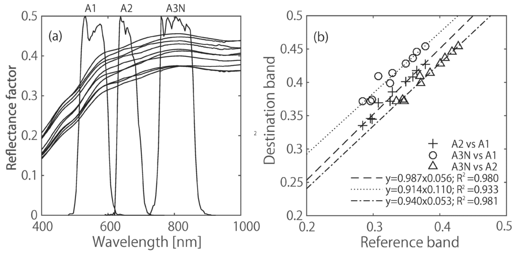 Vermote and Saleous [38] used a linear relationship between the retrieved surface reflectances for a site in the Sahara Desert for converting reflectances across MODIS onboard Terra and the Advanced Very High Resolution Radiometer (AVHRR) onboard NOAA 16 in cross-calibrating the AVHRR using MODIS. In the present study, the soil line [39] refers to the linear relationship between soil reflectances of any bands in the solar-reflective range, and we used the soil line obtained from ground-measured data for translating ASTER VNIR bands.