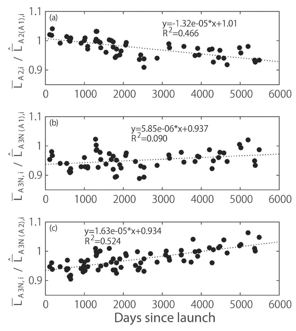 Results of inter-band radiometric comparison across ASTER VNIR bands, in which the effects of relative spectral responses (RSRs) are compensated using band translation. (a) Plot of the ratio of the Band 2 radiance to the Band 1 radiance that is translated into Band 2. (b) Results for Band 3N with reference to Band 1. (c) Results for Band 3N with reference to Band 2. The units of the slope of the regression equation are the inverse date.