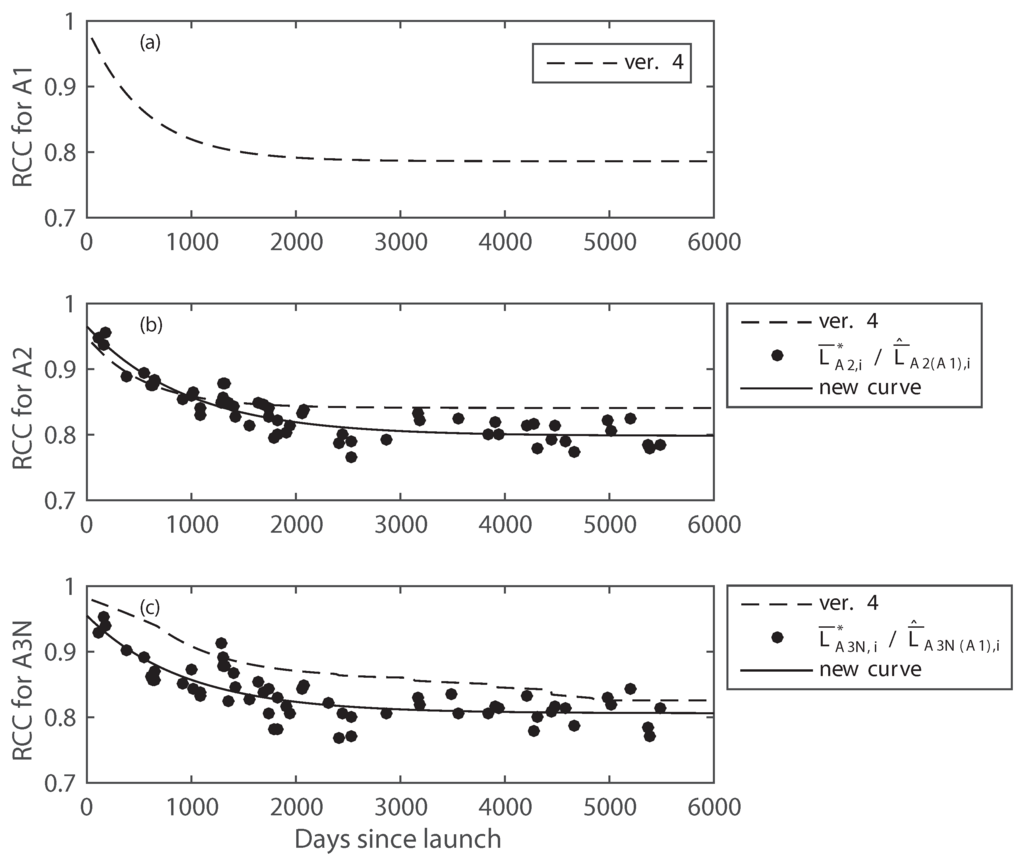 The (for Band 2) is derived using the current RCC, using an equation having the same form as Equation (3), whereas (for Band 3N) is derived using the current RCC, which is not represented by a mathematical function, but rather discrete values that vary with the specific term. The coefficients , and obtained by the fitting (the subscript D corresponds to either A2 or A3N) are used to calibrate ASTER Bands 2 and 3N.