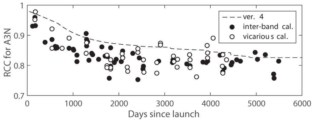 The data for Bands 1 and 2 measured in the high gain mode suffered from negative errors of 2% and 7%–10%, respectively, as detected by cross-calibration with MODIS and onboard electric calibration [18,51,52,53]. The errors have been corrected in L1 products processed by the current radiometric DB, i.e., ver. 4. However, in vicarious calibration and cross-calibration for deriving the degradation curve, negative errors of 2% in Band 1 data from the high gain mode (obtained by the previous version of the radiometric DB) were not corrected, because the errors are less than the uncertainty in the vicarious calibration (3%–5% [54]) and cross-calibration (likely more than 3% due to MODIS calibration uncertainty, RSR differences, spatial resolution difference, etc.). The negative errors of 7%–10% in Band 2 data for calibrations were, on the other hand, corrected for the derivation of the degradation curve.