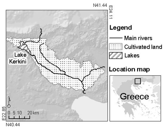 - Mertzianis, C. Management of water for Strimonas river and lake Kerkini during the irrigation season of 2007; Annual report; Prefectural Authority of Serres, Directorate of Water Resources: Serres, Greece, 2007. [Google Scholar]