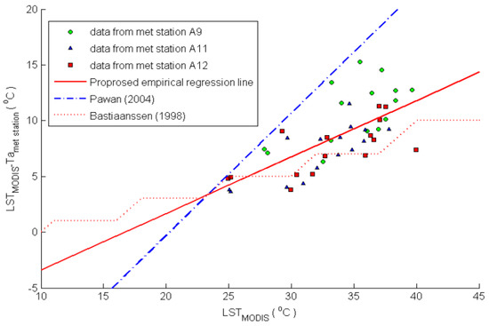 According to Figure 3, the Pawan [36] equation overestimates the LST to Ta temperature difference, while the equation proposed by Bastiaanssen et al. [19] provides closer estimations of the air temperatures. Since ground data are available, the use of the empirical linear relation is advantageous to allow modelling of the local weather conditions in a more realistic way.