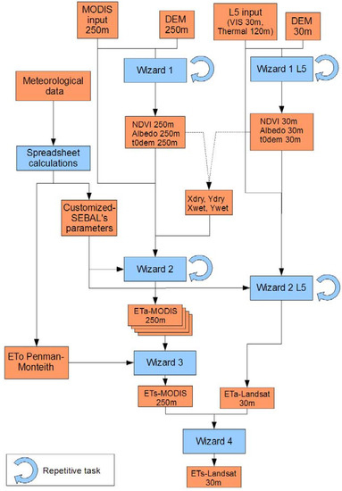 Each wizard offers a user-friendly interface that is accessible through an initial launching wizard. The downloading and pre-processing of MODIS, Landsat 5, and meteorological data is a pre-requisite for the use of the ITA-Water tool. In order to generate a high-resolution ETs map from the various input data the operation scheme presented in Figure 4 should be followed.